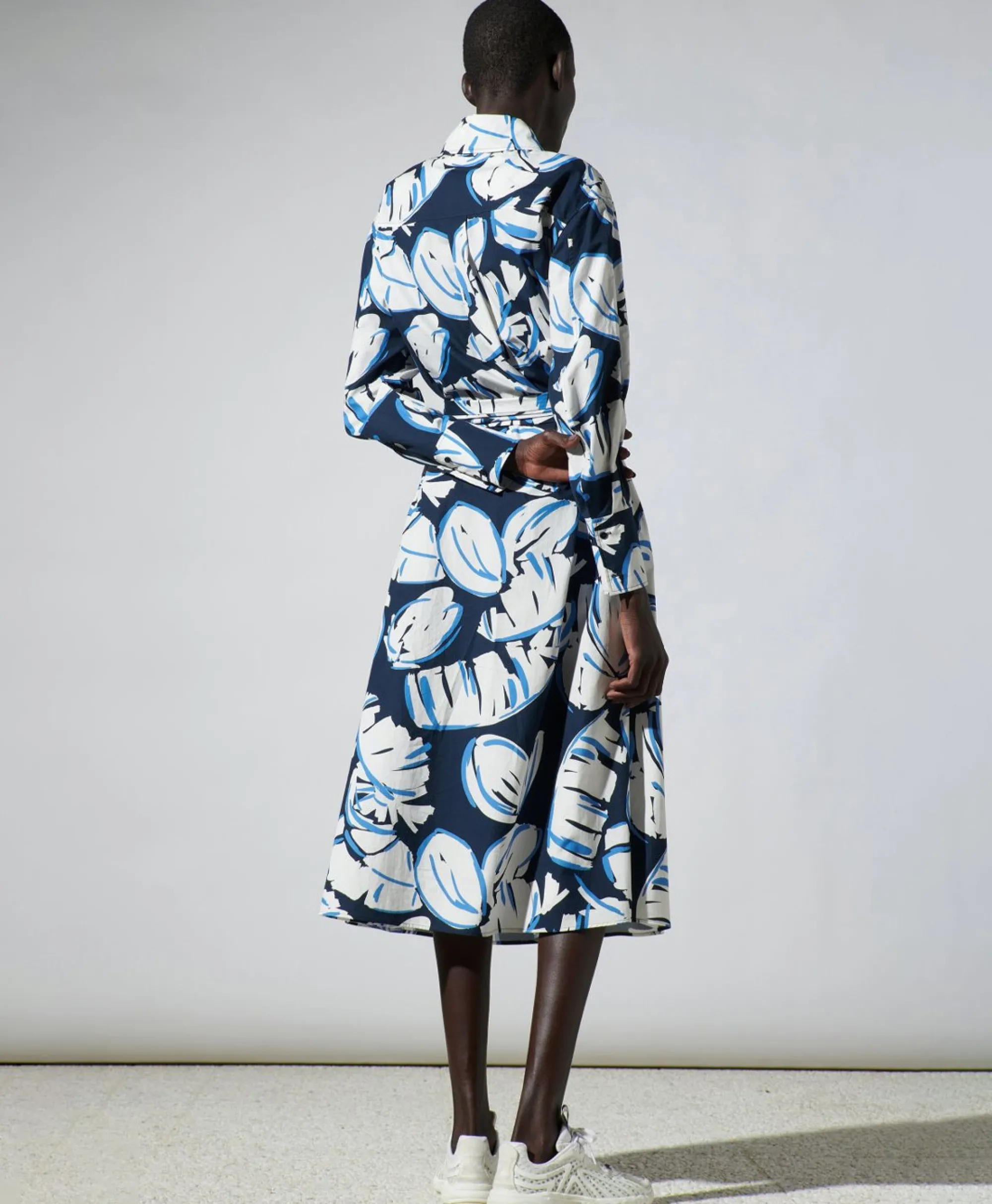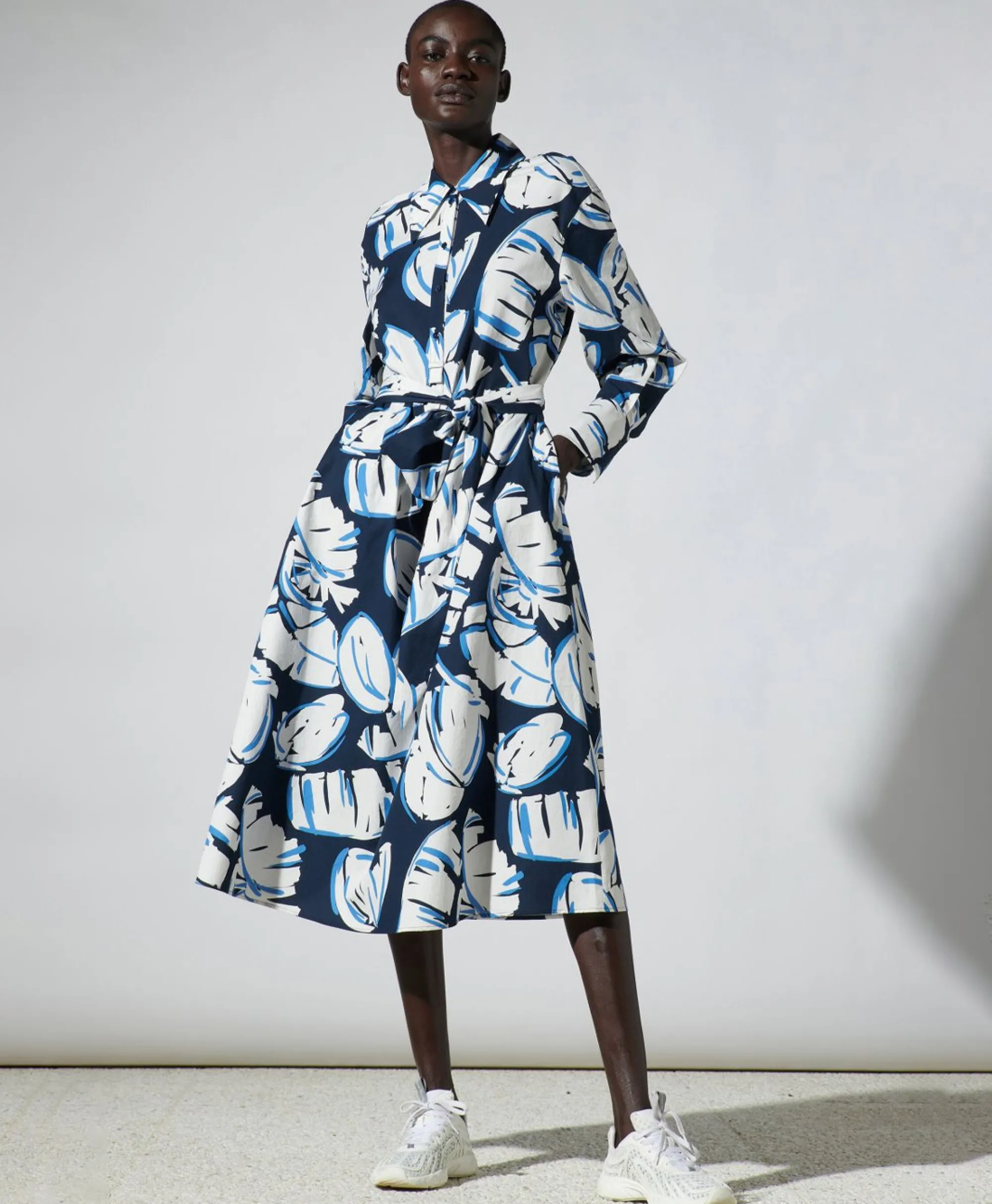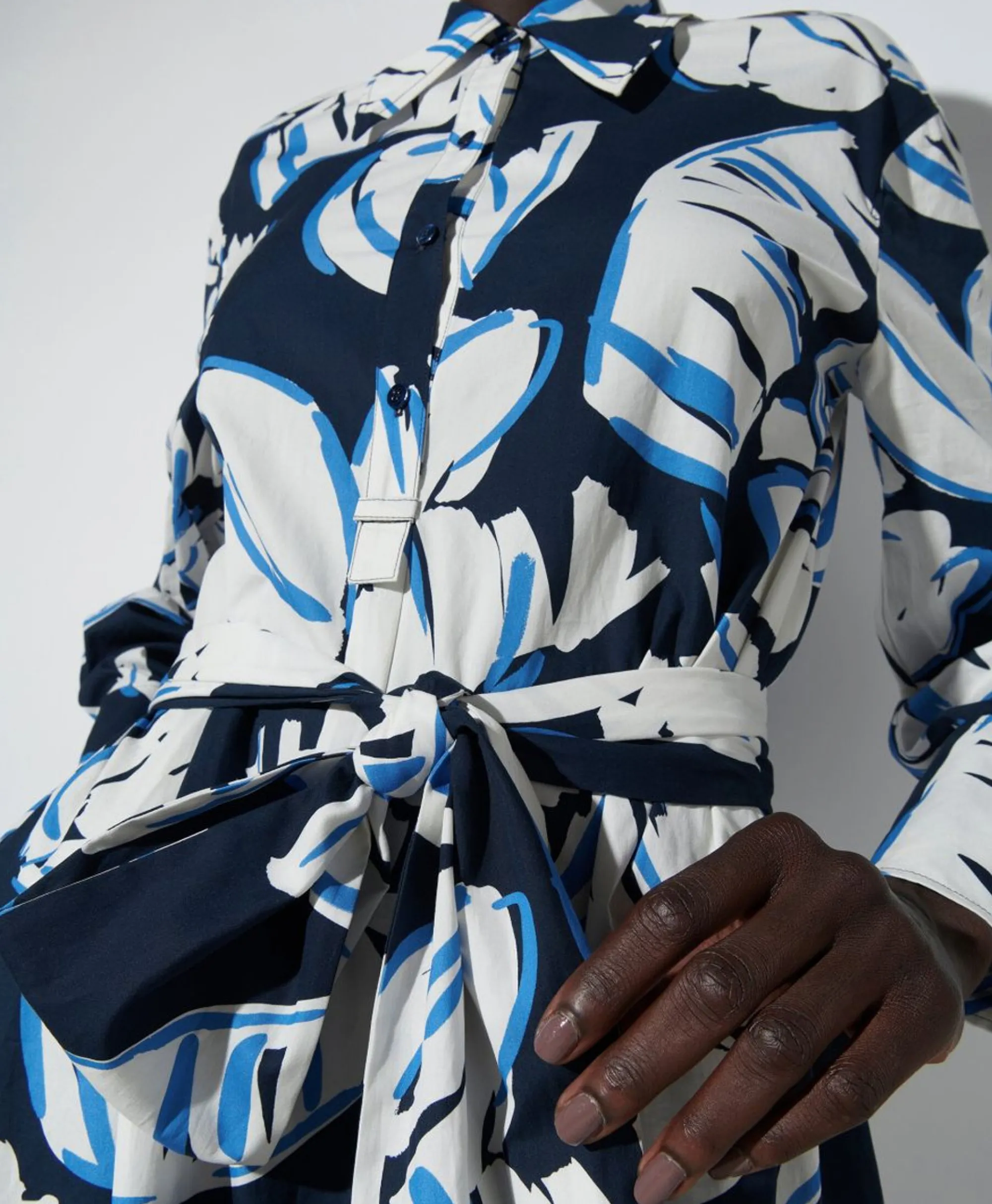Lange, Zomerse Overhemdjurk In Een Wijdvallende Pasvorm, Afgewerkt Met Halflange Knoopsluiting, Een Breed Strikceintuur En Twee Steekzakken. Materiaal: 100% Katoen. Het Model Is 178 Cm Lang En Draagt Maat 36.