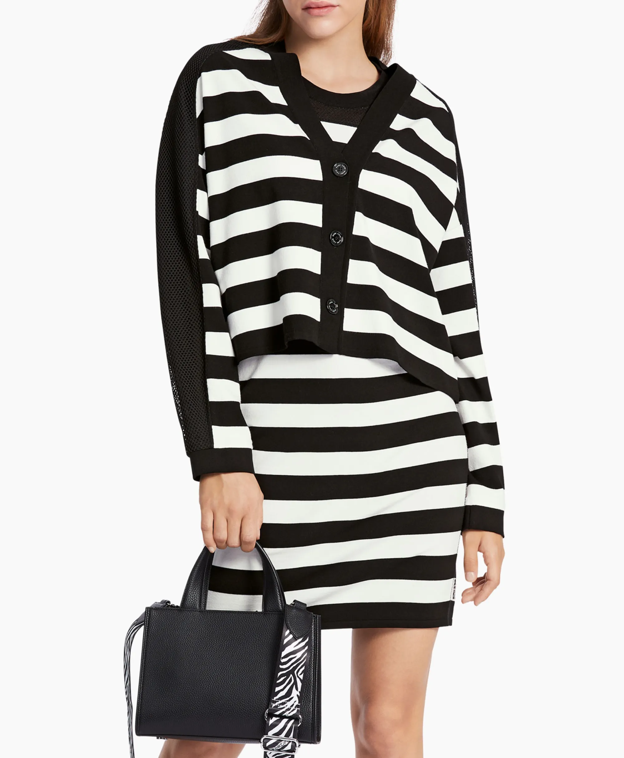 De Cardigan Is Van Een Zachte Vezelmix. De Voorkant Is In Blokstreep Gehouden, Op De Rug Is De Breedte Van De Strepen Gevarieerd. Schouders En Mouwen Zijn Met Inzetstukken Van Mesh Geaccentueerd. Het Model Draagt Het Duurzaamheidslabel ʽRethink Togetherʼ. Bovendien Is Het Knitted In Germany: Het Wordt In Duitsland Met Ultramoderne Technologieën Gebreid En Veredeld. De Afzonderlijke Delen – Zoals Rug- En Voorpand Etc. – Worden In Europese Partnerbedrijven Aan Elkaar Genaaid. Het Model Is 179 Cm Lang En Draagt Maat N3 / 38. Materiaal: 82% Katoen, 18% Polyamide, 100% Polyester, 70% Viscose, 30% Polyester.