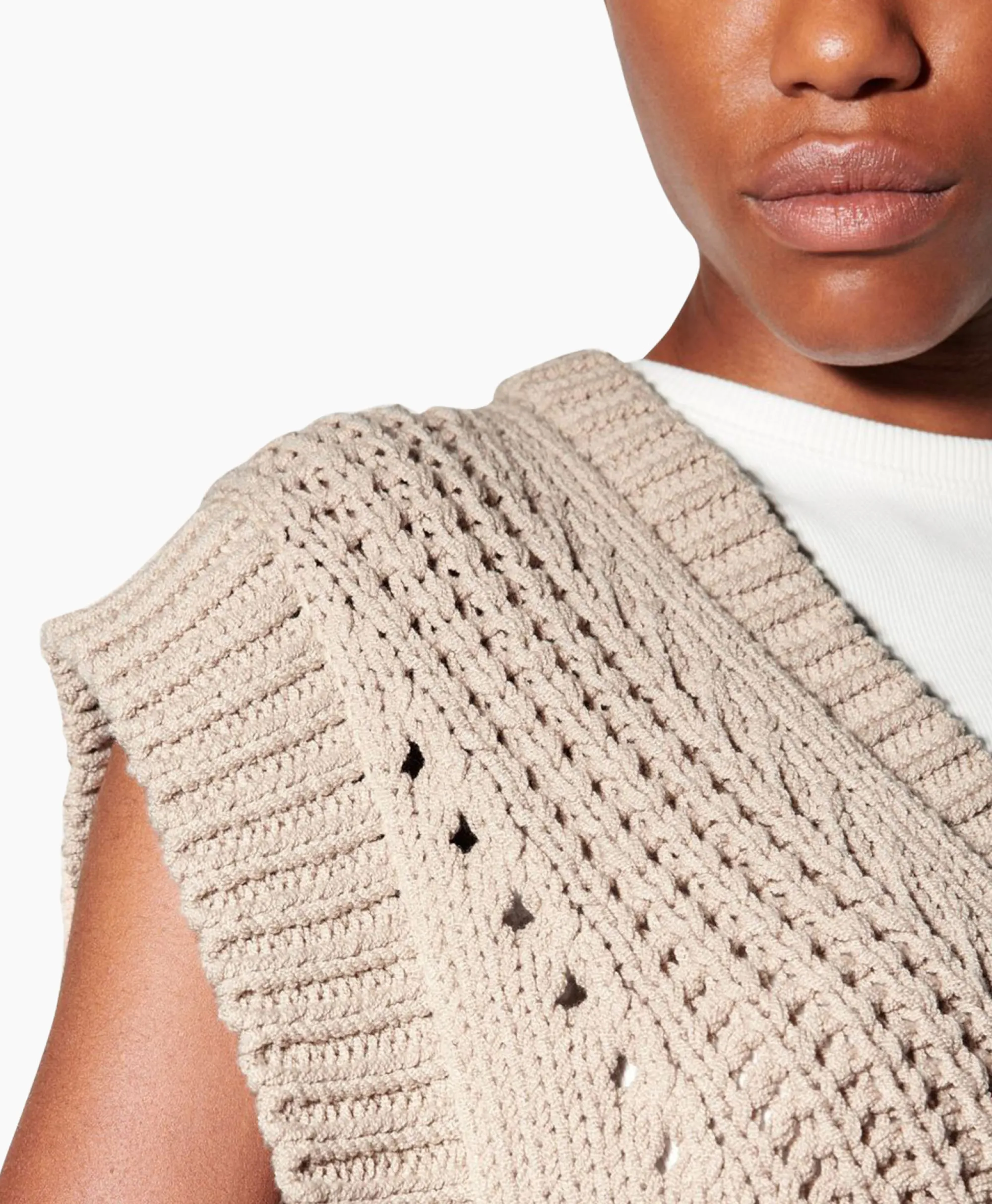 Tanktop Van Italiaans Katoenen Garen Met Een Handgebreide Look En Een Crêpe-Effect. Het Ontwerp Wordt Afgerond Met Een Ingewikkeld Gebreid Patroon, Een Diepe V-Hals En Geribde Zomen. Ons Model Is 178 Cm Lang En Draagt Maat 36. Materiaal Buitenzijde: 78% Katoen, 22% Polyamide.
